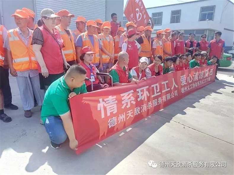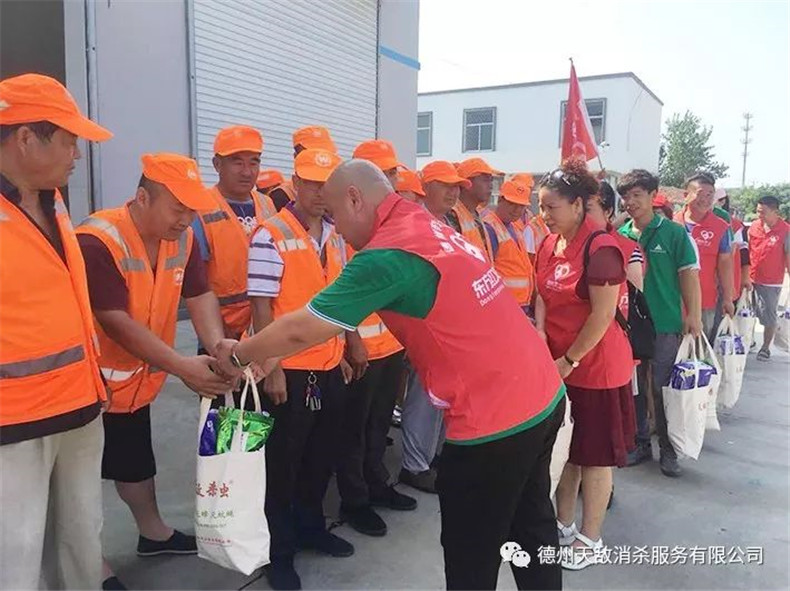 8月4號(hào)上午,天敵消殺服務(wù)有限公司,攜手東方紅義工團(tuán),來到德州市環(huán)境衛(wèi)生管理處,為環(huán)衛(wèi)工人送去愛心。環(huán)衛(wèi)工人是我們每個(gè)城鎮(zhèn)不可缺少的一部分,他們每天辛勤的給我們美化著我們的城市,沒有他們就沒有我們干凈整潔的環(huán)境!