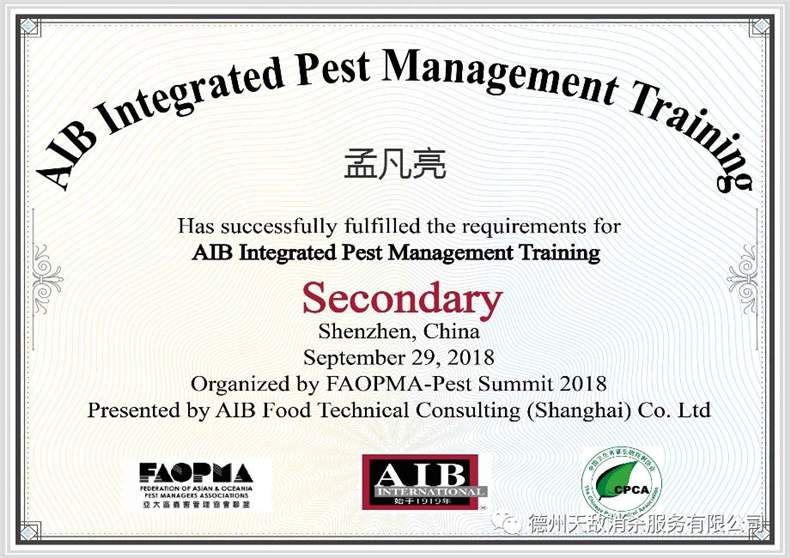 本次會(huì)議內(nèi)容涵蓋“健康與病蟲害管理、食品安全與蟲害防制、大眾健康教育、登革熱等病媒傳播疾病流行特點(diǎn)、衛(wèi)生用農(nóng)藥風(fēng)險(xiǎn)評(píng)估、病媒生物控制標(biāo)準(zhǔn)、無人機(jī)與蟲害防制、倉(cāng)儲(chǔ)害蟲防制技術(shù)、紅火蟻防制技術(shù)、有害生物防制網(wǎng)約服務(wù)模式、數(shù)字防控嚙齒動(dòng)物及新技術(shù)新方法等蟲害管理領(lǐng)域的熱點(diǎn)及難點(diǎn)問題;期間,孟凡亮經(jīng)理還參加了AIB食品安全綜合蟲害管理培訓(xùn)。