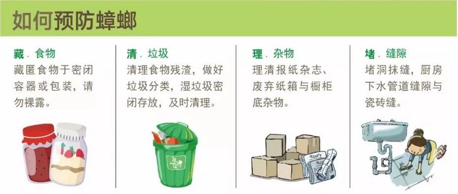 防患未然,應從居家細節(jié)入手。預防蟑螂可從“藏、清、理、堵”四個步驟做起。讓“打不死的小強”無處藏身。