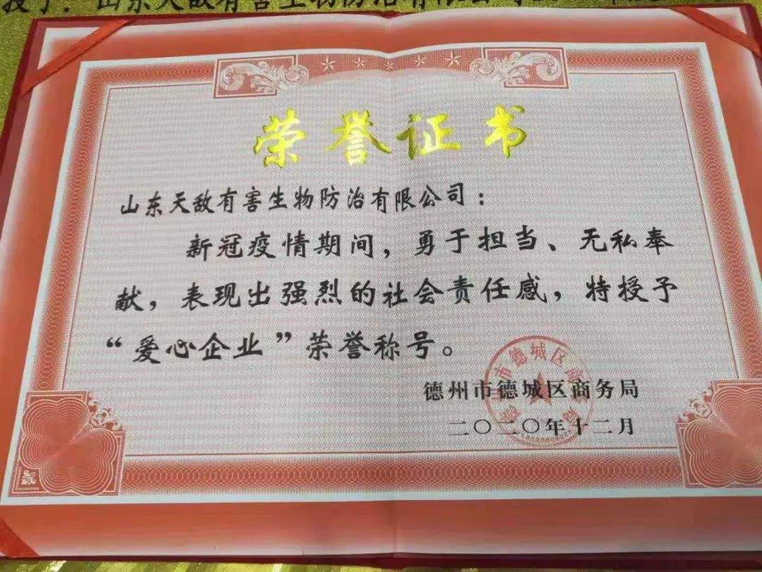 在全國上下共同防疫的關鍵時刻,山東天敵有害生物防治有限公司挺身而出,對二十余家公共場所進行無償消毒,在消毒用品緊缺的情況下,我司將庫存價值50萬的消毒用品(消毒片、消毒設備等)無一銷售,全部用于無償消毒并捐贈。